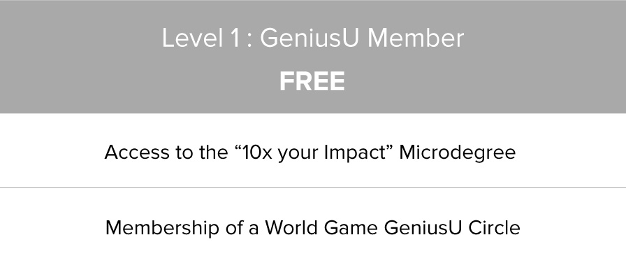 You can join the World Game - with the goal to increase your income and Impact over the next 6 months. Using GeniusU, the platform for you to play the game, you’ll get the steps to follow your personal path to entrepreneurial success, with what to learn, who to connect with and what to do.