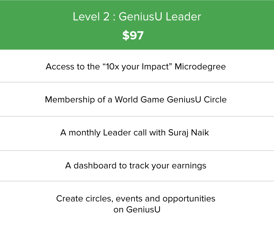 For just $97 per year or $9 per month, to play the World Game as a Leader on GeniusU.