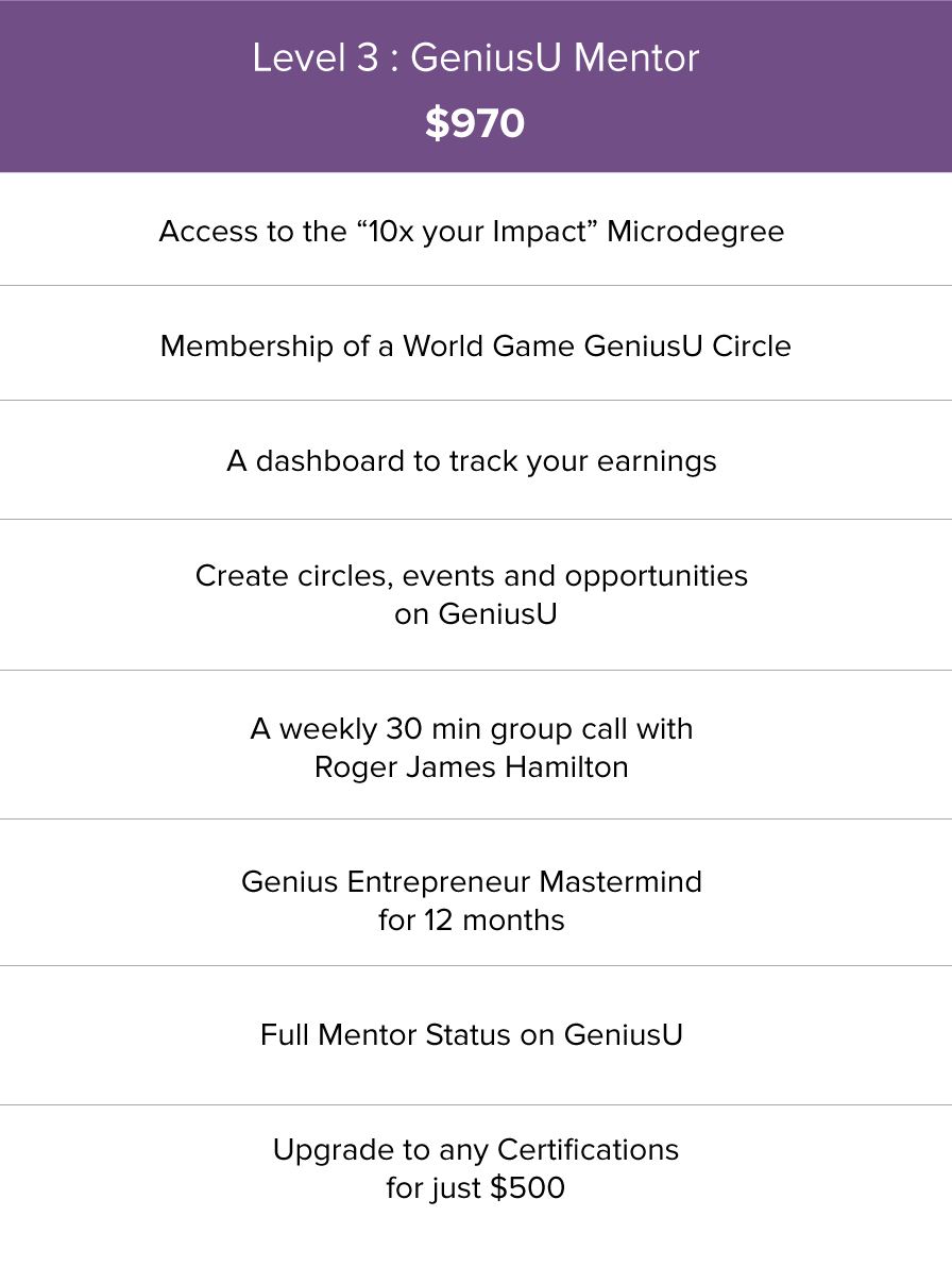 For just $970 per year or $97 per month, to play the World Game as a Mentor on GeniusU.